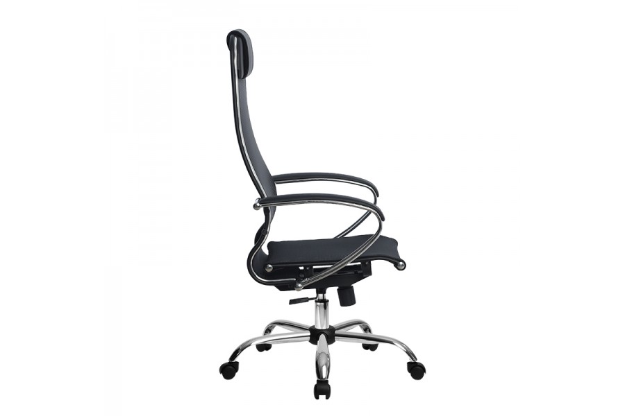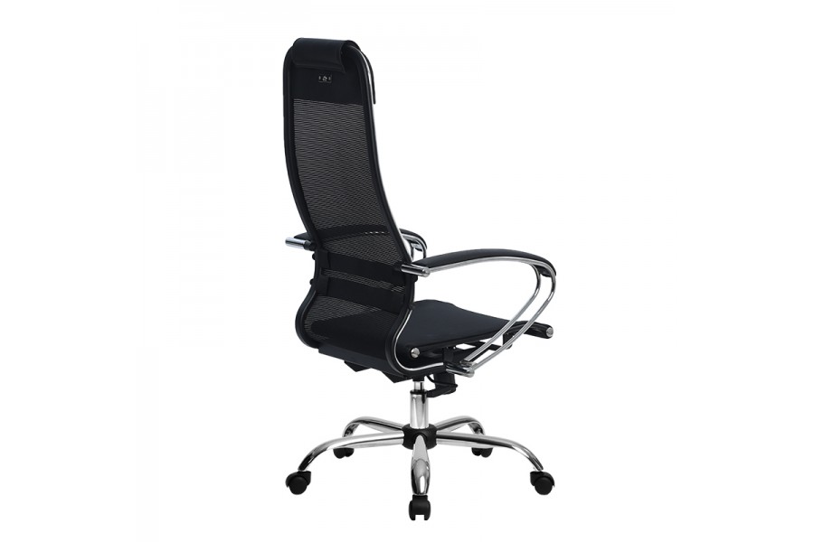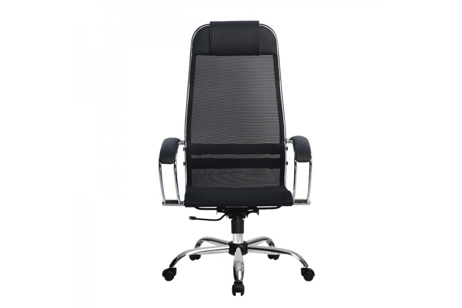 Спинка: высокая с мягким подголовником, черное полимерное покрытие каркаса с хромированным молдингом, ширина 475 ммВид обивки спинки: сетка натяжная без прошивки (сетка X2). Подлокотники: стальные классические покрытые зеркальным хромом,обивка накладок: экокожа. Сиденье: на стальном каркасе с черным полимерным покрытием, ширина 475 мм. Вид обивки сиденья: сетка натяжная без прошивки (сетка X2) . Базовые цвета материалов: черный. Механизм качания: топ-ган