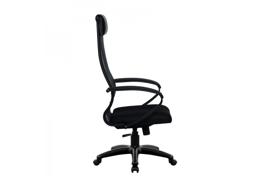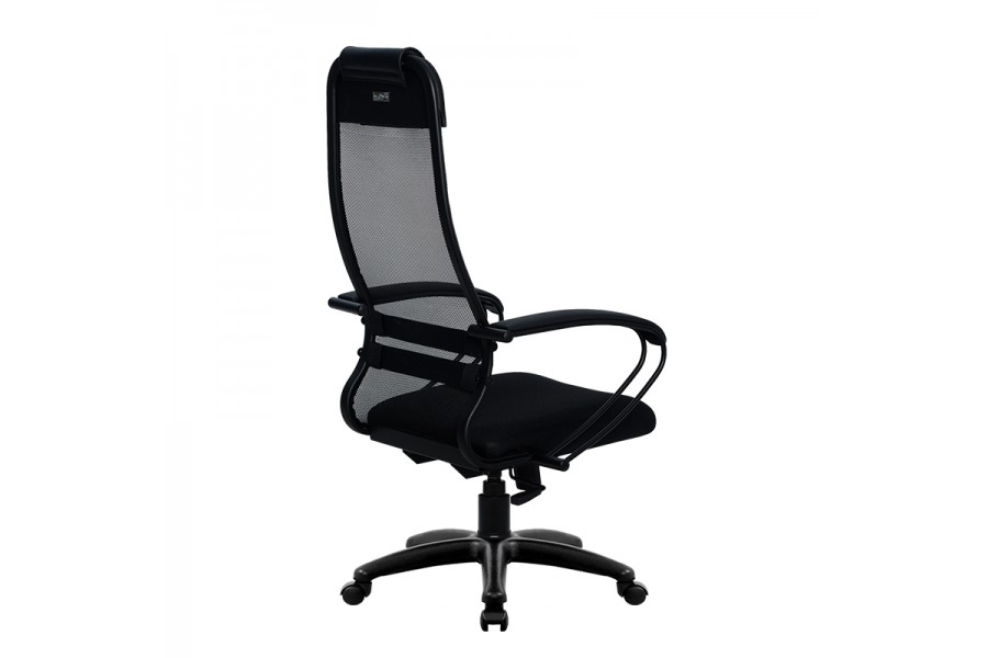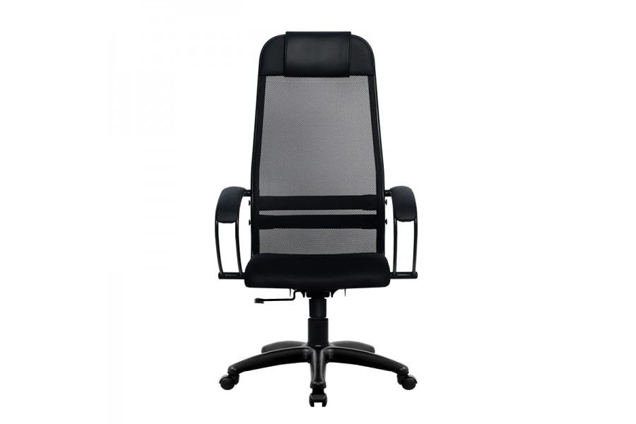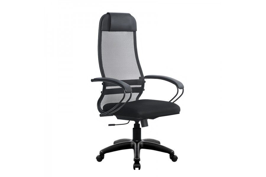 Спинка: высокая с мягким подголовником, черное полимерное покрытие каркаса, ширина 475 ммВид обивки спинки: сетка натяжная мягкая без прошивки. Подлокотники: стальные классические с полимерным покрытием черного цвета,обивка накладок: экокожа. Сиденье: мягкое обьемное на столярном каркасе, ширина 475 мм. Вид обивки сиденья: износостойкая сетчатая ткань без прошивки