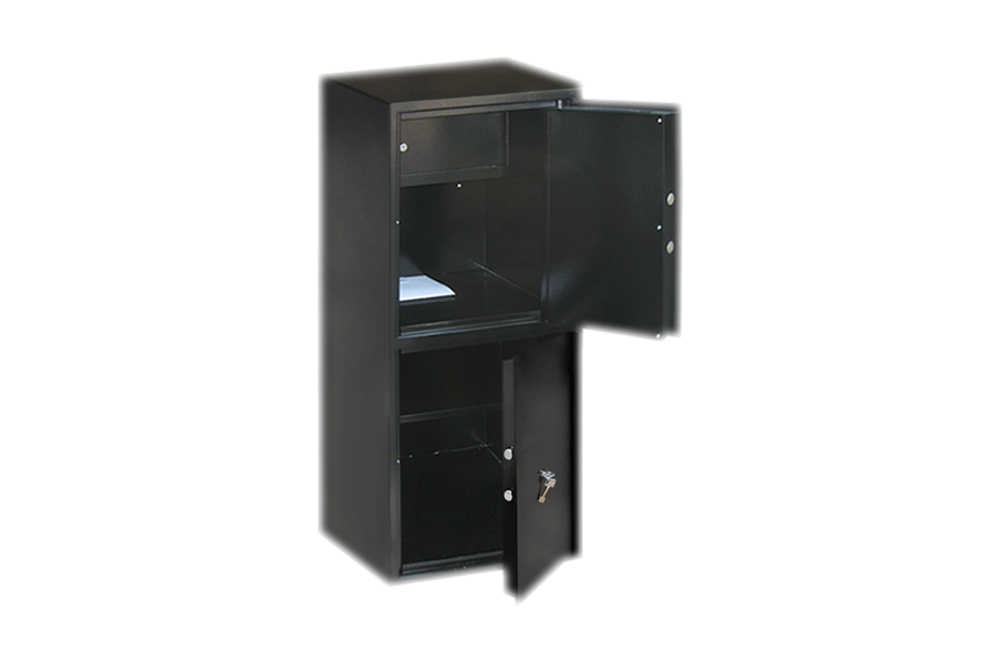 Толщина двери 6 мм, толщина корпуса 2 мм, имеется отдельно запираемый на замок Euro-Locks (Польша) трейзер, 2 полки, регулируемых по высоте, дверь запирается сейфовым замком Border (РФ). Корпус имеет отверстия в задней стенке для крепежа к стене. Цвет: черный (RAL 9005).