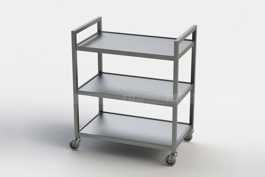Тележки имеют цельносварной каркас, выполненный из нержавеющей стали квадратного профиля, полки, выполненные из пищевой нержавеющей стали, и 4 колесные опоры. Одна колесная опора снабжена блокировкой, предотвращающей нежелательное перемещение тележки.