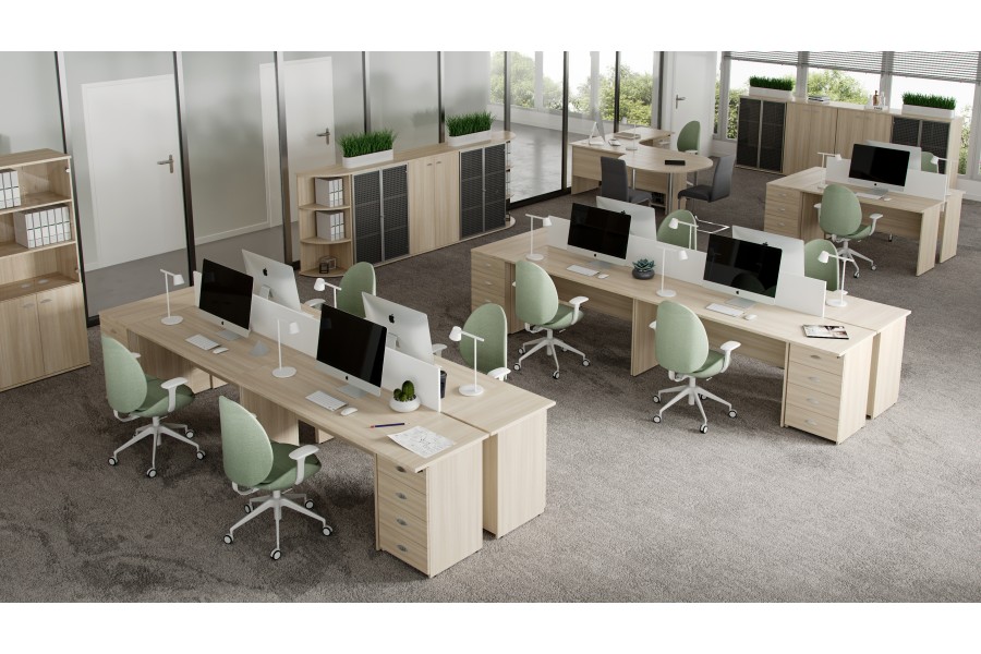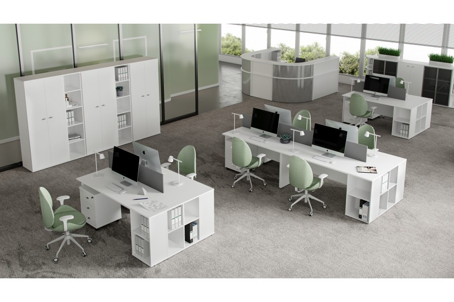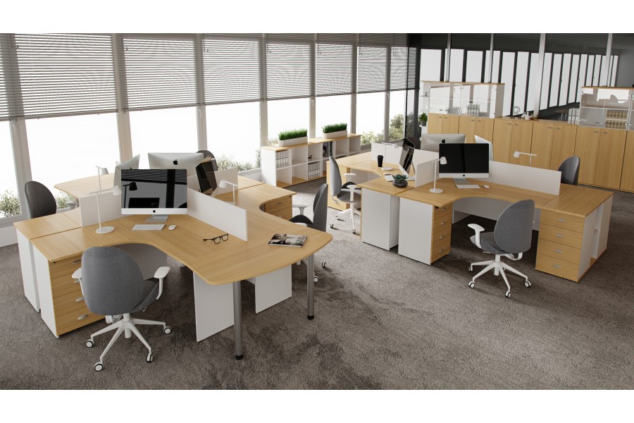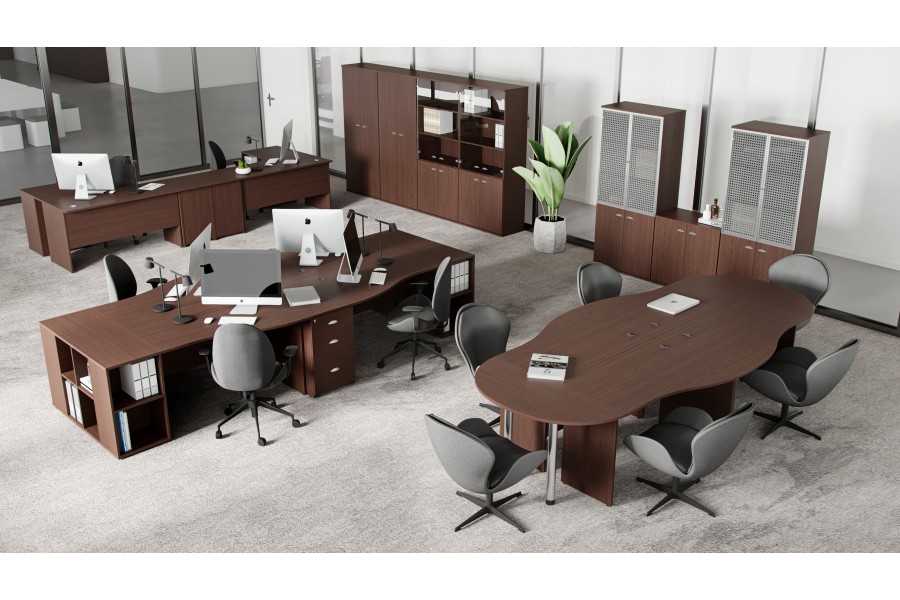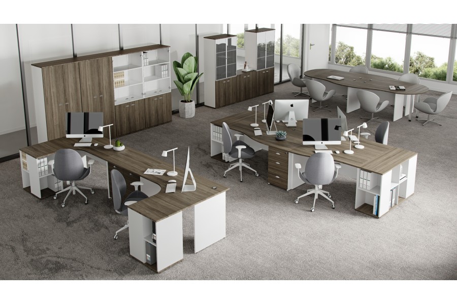 Модульные системы. В коллекции используется модульный принцип установки рабочих мест, что позволяет создавать как отдельные кабинеты, так и цельное офисное пространство. Модульность мебели в сочетании с простотой дизайна позволяют грамотно использовать свободную площадь, располагая предметы таким образом, чтобы сотрудник не терял необходимую для работы мобильность.