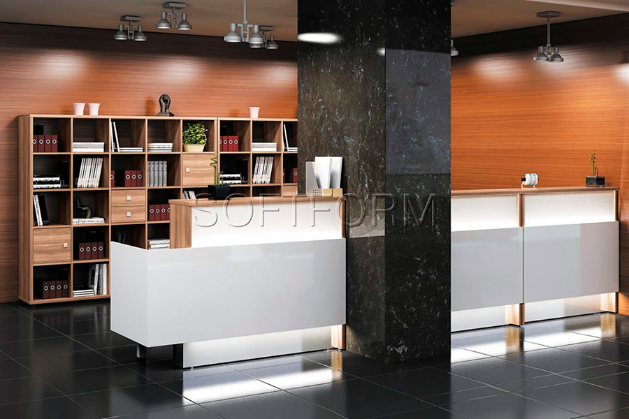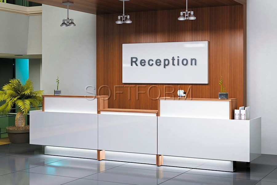 - Использование на рабочей поверхности светодиодной подсветки подчеркивает простой и лаконичный дизайн рецепции;