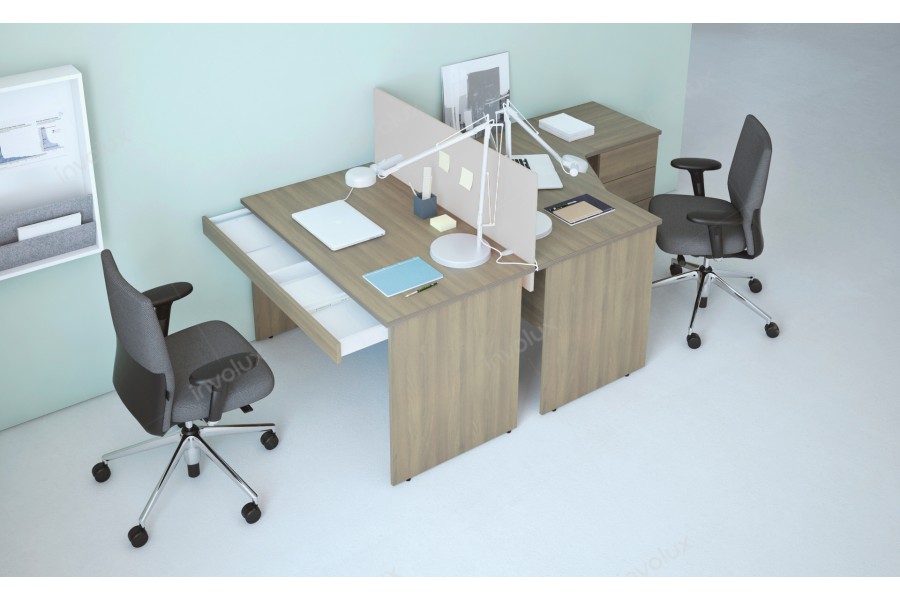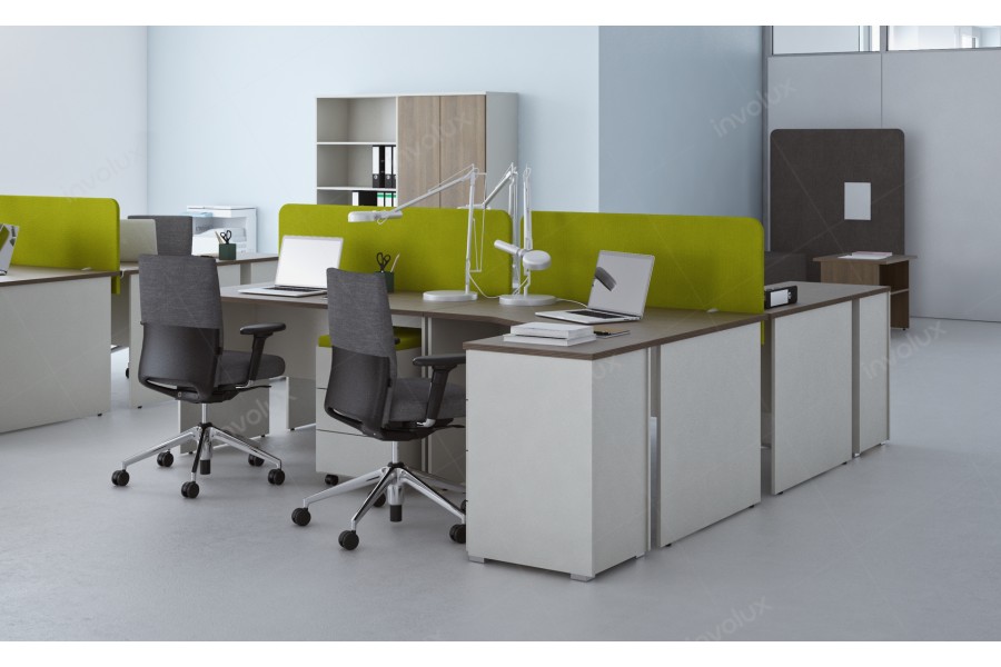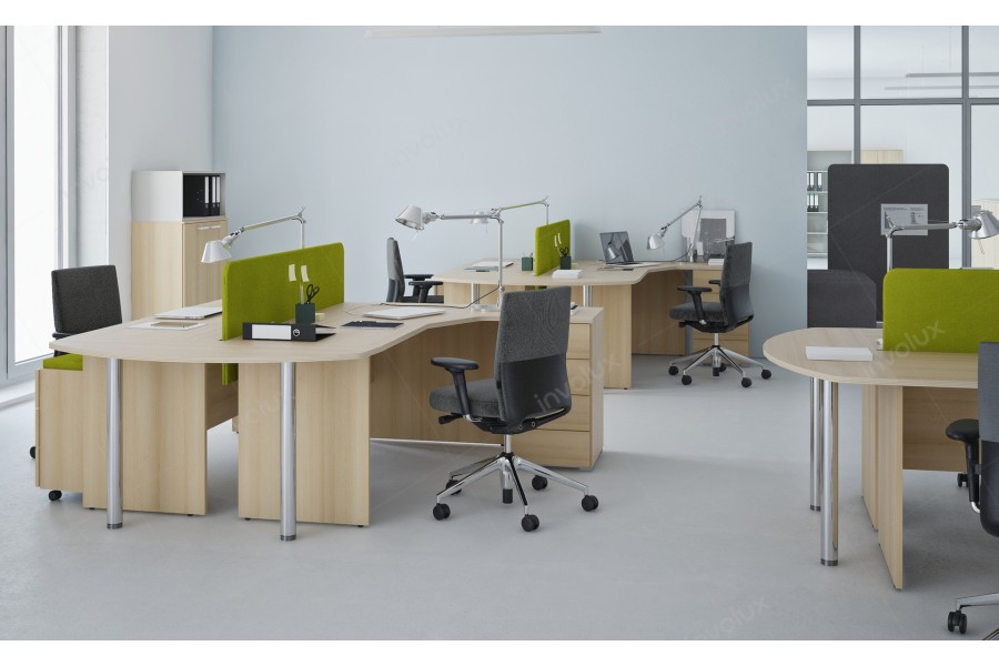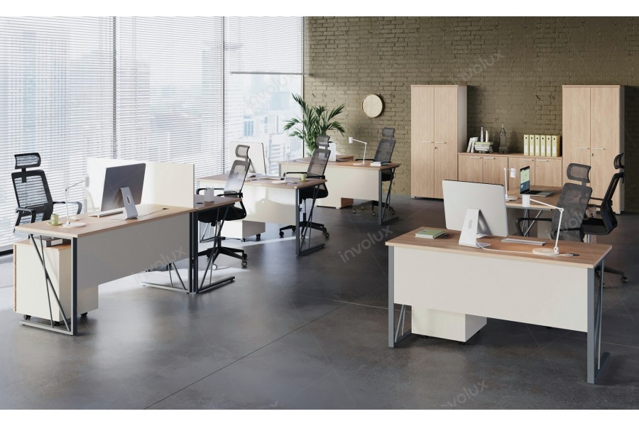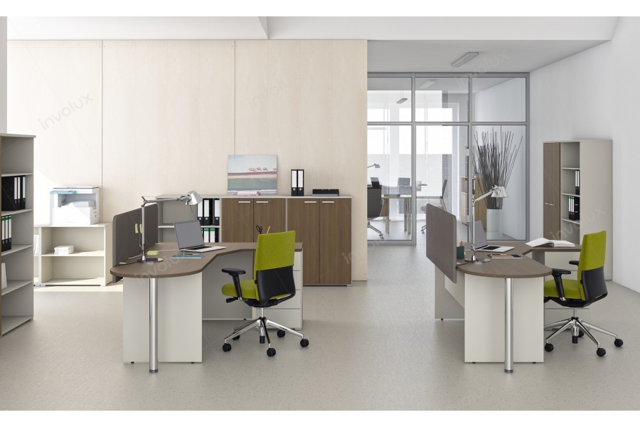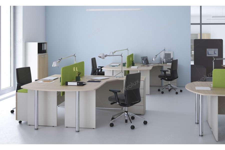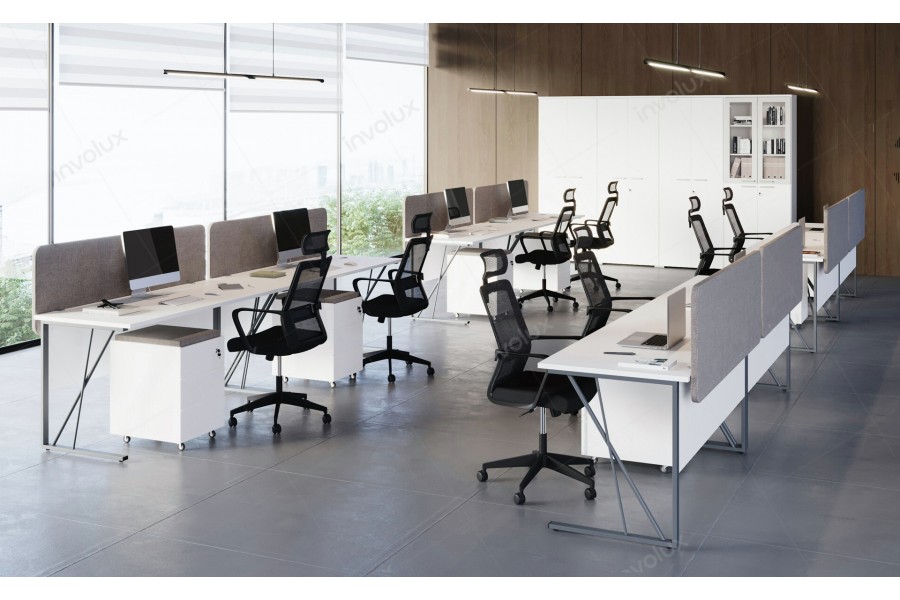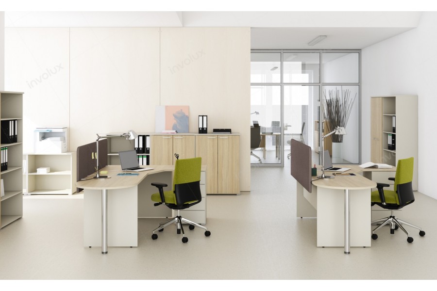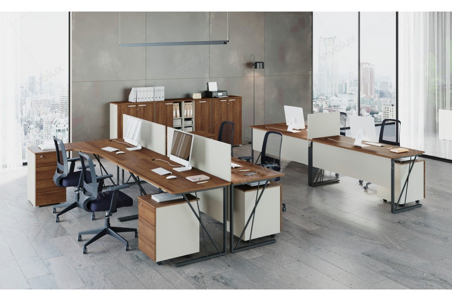 - В зависимости от дизайнерского решения столы для сотрудников могут размещаться отдельно, так и группами.