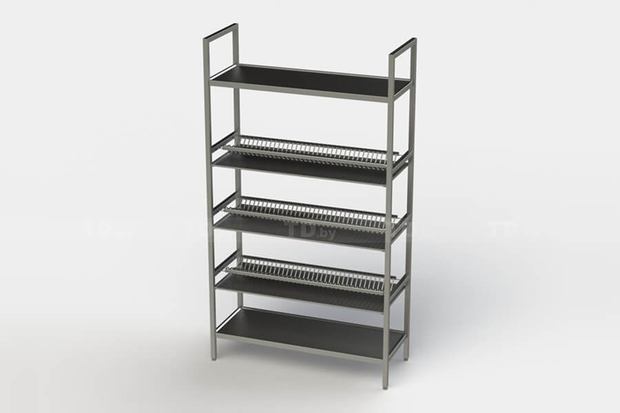 Изготавливаются полностью из нержавеющей стали. Стойки стеллажа изготавливаются из профильной нержавеющей трубы 25х25мм, полки из нержавеющей стали толщиной 1 мм марки AISI430 или AISI 304.