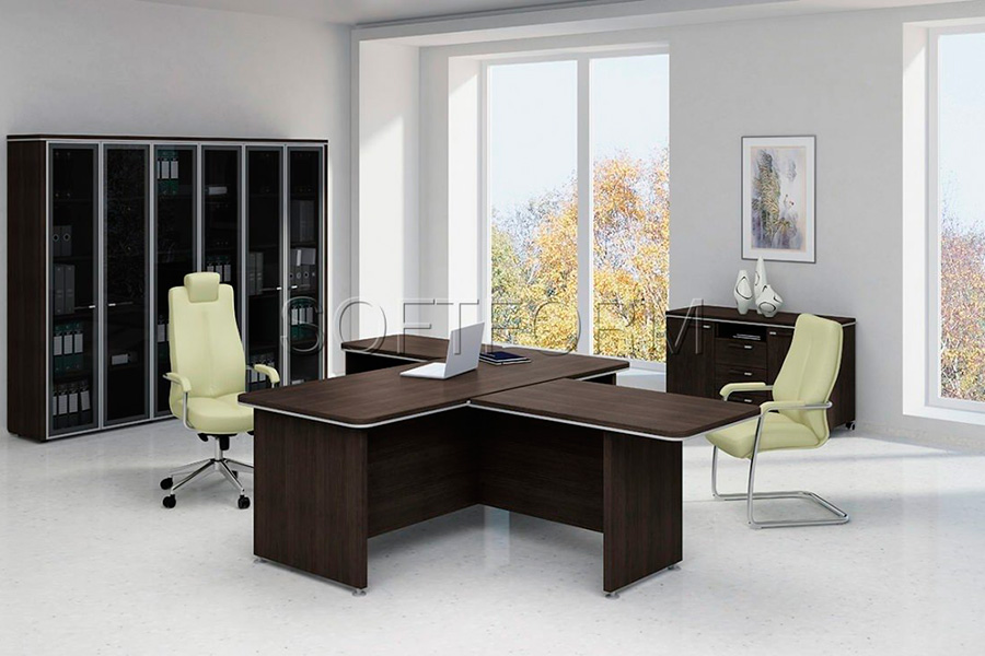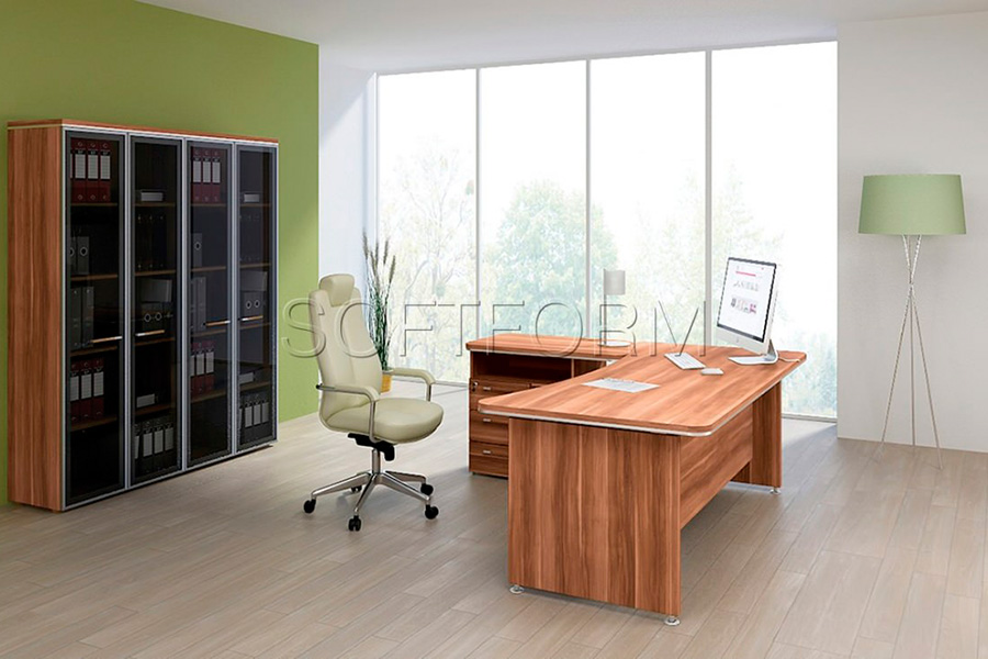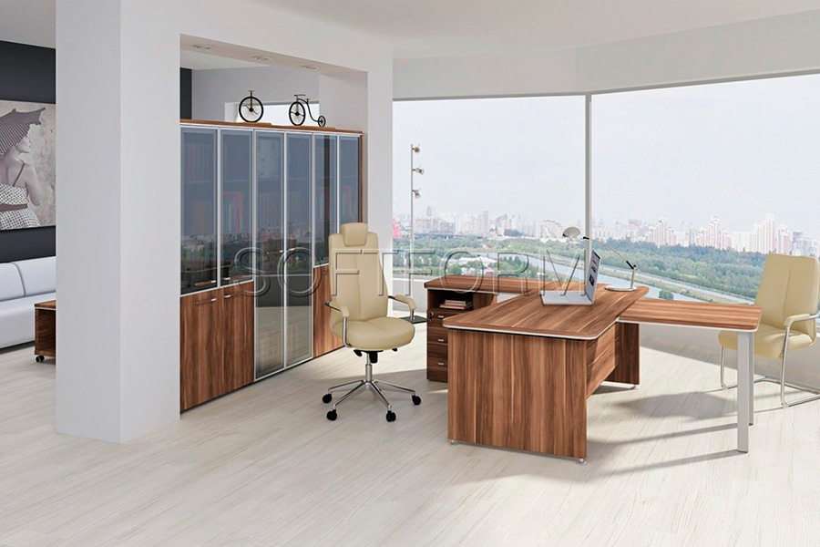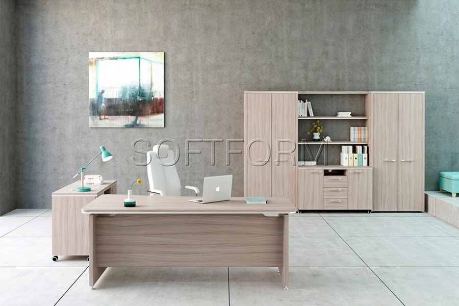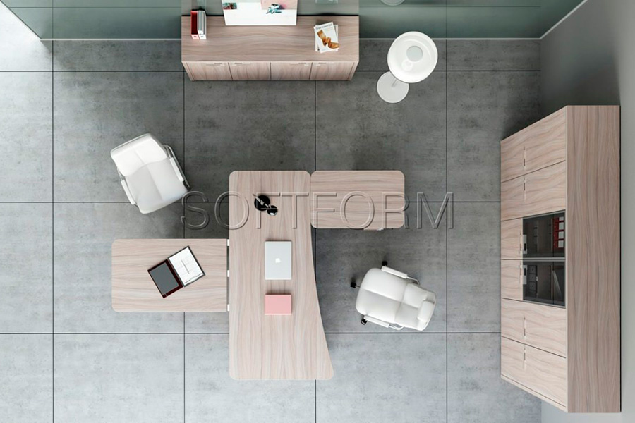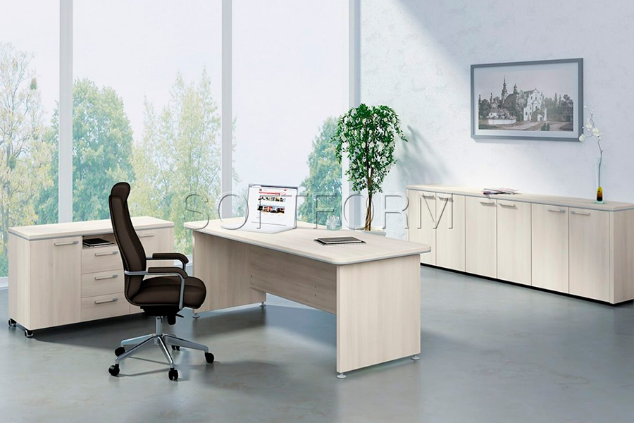 - Особенностью коллекции являются лаконичные формы без острых углов и ассиметричные рабочие столы;